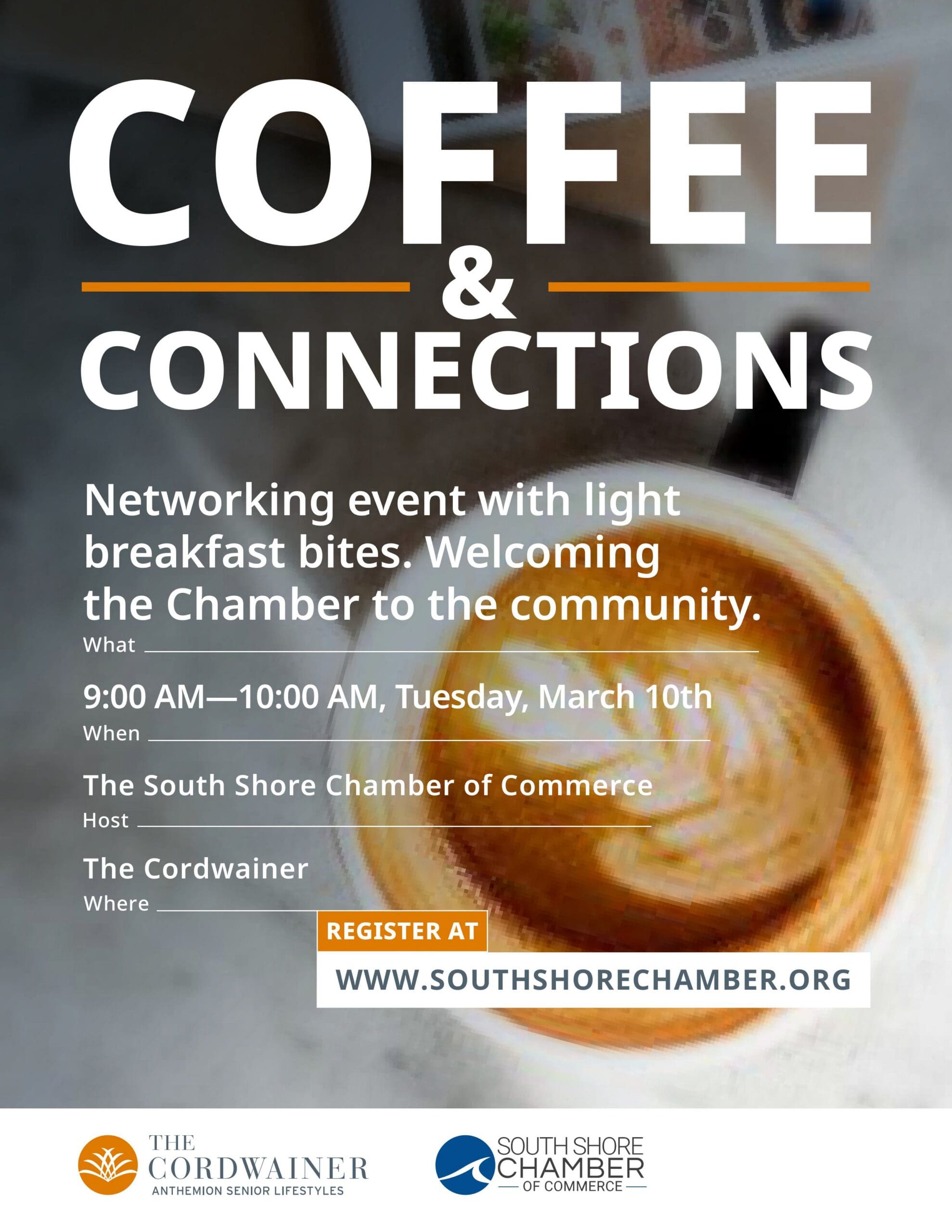 A promotional flyer for Coffee & Connections, a networking event with breakfast for professionals and caregivers, hosted by The South Shore Chamber of Commerce on March 10th, 9–10 AM at The Cordwainer. Includes website for registration.